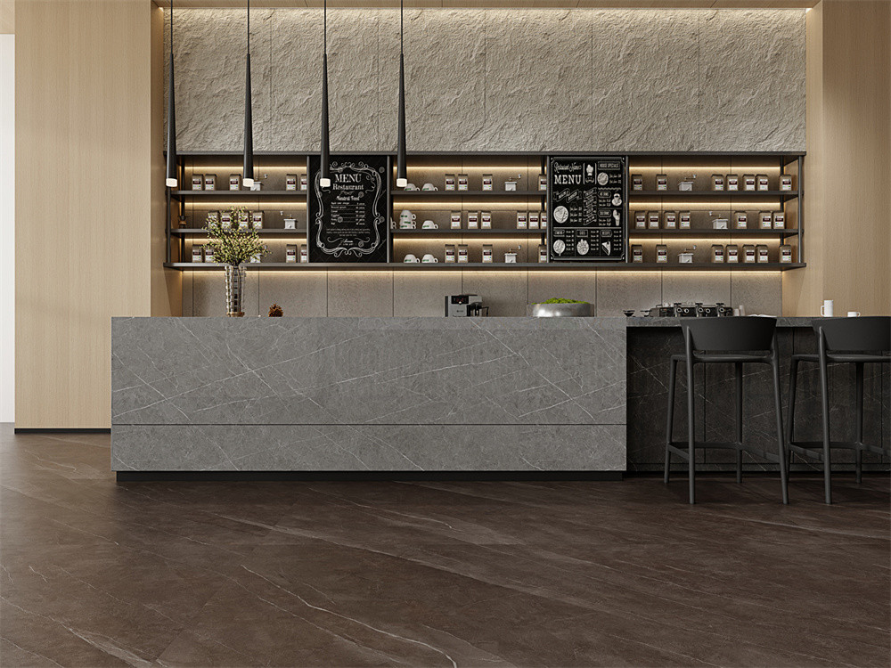 La superficie lucida delle lastre di pietra sinterizzate lucidate non solo aggiunge uno strato di raffinatezza, ma offre anche i vantaggi pratici della durata e dei bassi requisiti di manutenzione.Questo garantisce che la parete del televisore si distingua come un pezzo centrale che emana stile e senza tempoIl grigio medio e la texture liscia delle lastre di pietra sinterizzate lavorano insieme per formare uno sfondo coeso, rendendolo un complemento ideale per una vasta gamma di stili di interior design.