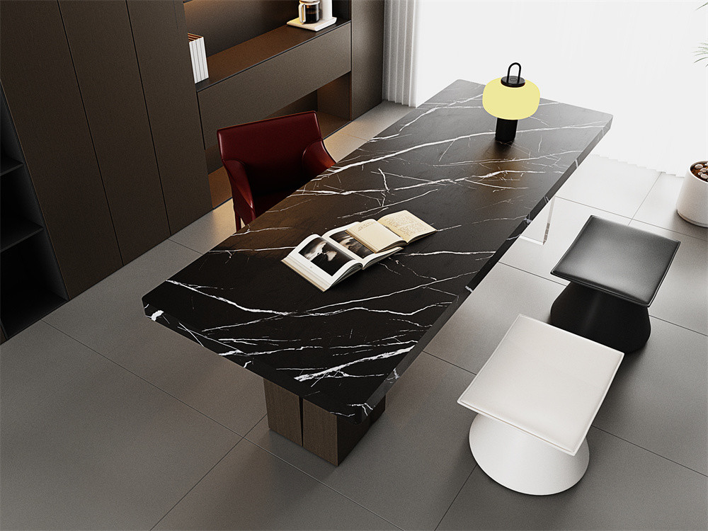 Trasforma il tavolo da caffè con lastre di pietra matt sinterizzate.Questo materiale di alta qualità è una miscela del fascino estetico della pietra naturale con la durata e la facilità di manutenzione delle lastre di pietra sinterizzata neraE' opinione diffusa che le lastre di pietra sinterizzate antiscivolo siano una scelta ideale per una superficie sia alla moda che pratica.Sono perfetti per aggiungere un tocco di raffinatezza moderna al tuo soggiorno..